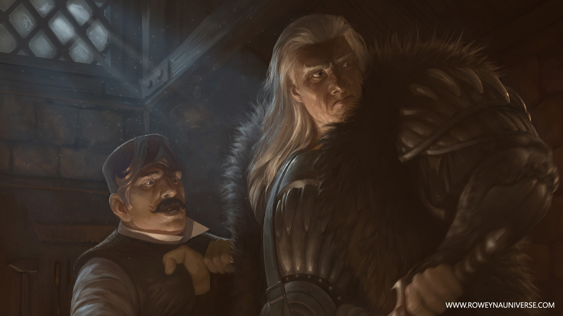 « Maintenant qu’il se trouvait au milieu de la pièce sa haute stature et son allure étaient terrifiantes, Roweyna et Vladim sans même s’en apercevoir avaient reculé devant l’impressionnante carrure, son visage était carré, sa mâchoire proéminente répondait à de lourdes arcades sourcilières qui masquaient presque totalement de petits yeux enfoncés profondément dans leurs orbites. De longs cheveux blancs se répandaient en cascade sur ses épaules, celles-ci étaient couvertes par les épaulières de son armure que couvrait en partie un épais manteau en fourrure noire. Les plaques de jais de son armure s’ajustaient si parfaitement qu’on aurait pu croire que des écailles avaient remplacé sa peau. Sur son flanc pendait une lourde épée dont le pommeau en acier noir représentait une tête de griffon hurlant. »