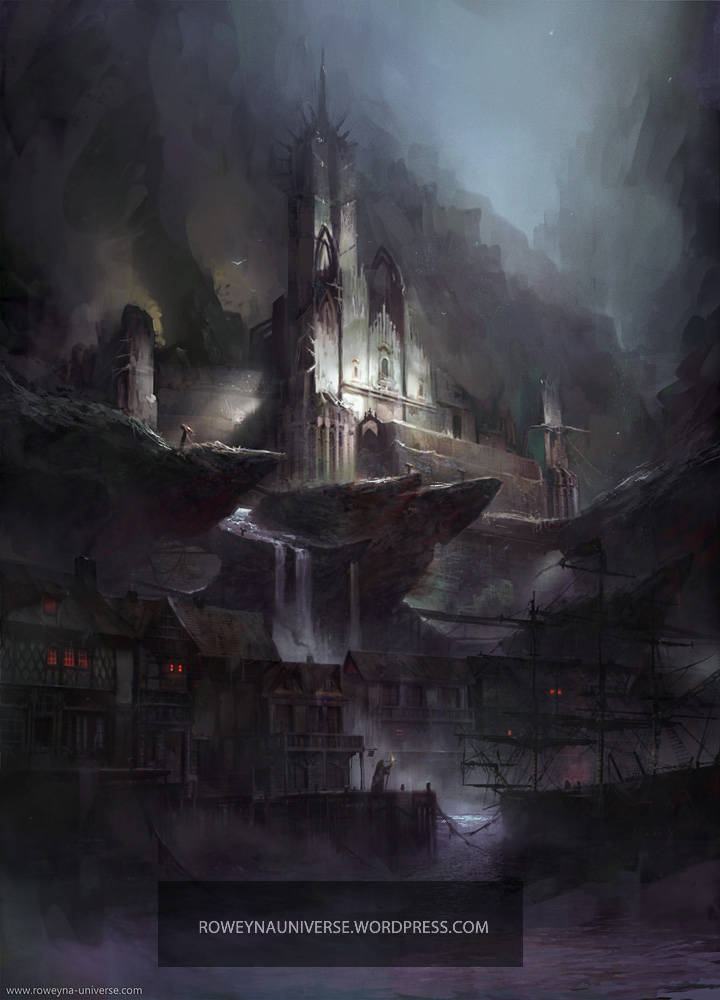 La cité est divisée en trois entités, la Forteresse qui abrite la ville originelle, bien protégée par de hautes murailles de granit et de marbre blanc. On y trouve les principales administrations qui régissent la région ainsi que l’Académie de guerre et du savoir, l’ordre religieux du Dragon sous l’autorité du Vicaire DeGothe, la caserne des chevaliers Dragons ainsi que la Tour du Conseil où siègent les membres les plus influents de la cité. Il y a la ville blanche, de beaux bâtiments où vivent les riches familles de marchands et où le commerce se fait principalement sous les arcades et les grandes rues dégagées. L’architecture se rapproche grandement de l’intérieur de la Forteresse, ses habitants cherchant sans doute à gommer le fait que seuls les plus importants y vivent. Puis il y a la ville basse et le Port qui s’étalent à l’ombre de la cité. Telle l’ombre de celle ci elle descend en pente jusqu’à la falaise en un amas de moins en moins construit de baraquements. En dessous, relié l’un à l’autre par des échafaudages de bois et de fer, servant à acheminer les denrées qui arrivent des navires, se trouve le Port. C’est un endroit peu sur, laissé aux mains du Syndicat des marchands qui en secret partage le même chef que la guilde des voleurs. Les habitations reposent à même des pilotis au dessus des eaux tumultueuses qui viennent se fracasser contre la falaise, construites les unes au dessus des autres il n’est pas rare que certaines se retrouvent lors d’une tempêtes au fond de l’océan. Les navires marchands et pirates de tous horizons viennent y vendre leurs butins ou leurs richesses ce qui en fait l’endroit le plus dangereux de la ville. Les navires s’amarrent à même les maisons, à l’abris des yeux indiscrets pour y charger ou décharger leurs marchandises plus ou moins honnêtes.