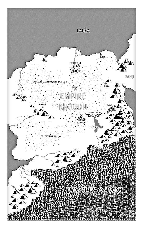 Maintenant que la carte est dévoilée, vous pouvez voir l’Empire Khogon dont la capitale porte le nom Oq-Khorogh (première impératrice Khogon. voir illus.). C’est un endroit quasi-désertique au nord et montagneux au sud, un peu à l’image du Nevada. Je n’en dirais pas plus pour ménager le suspense. Plus au sud vous pouvez voir les jungles Oowni, sachez aussi qu’on y fera un tour dans le tome 4.