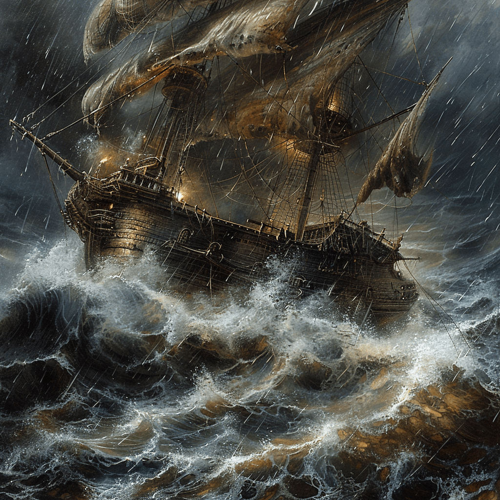 C’est après cela que les choses se gâtèrent. Tandis que nous remontions vers le nord pour reprendre notre route, nous fûmes pris en chasse par des pirates. Malgré un vent arrière bienvenu, l’étrange navire ne cessait de gagner du terrain sur nous. Quand je dis étrange, c’est parce que je n’en avais encore jamais vu de pareil. C’était un bâtiment de taille plus modeste que le nôtre mais l’assortiment et la disposition de sa voilure le rendait terriblement efficace avec ces vents tourbillonnants. Au bout d’une heure de poursuite, nous fûmes enfin à porter de canon. Si nous n’avions pas eu autant de passager, je pense que le capitaine aurait directement fait face à nos poursuivants, mais espérant que la lassitude finisse par les gagner, nous voguâmes ainsi jusqu’à l’ennui.